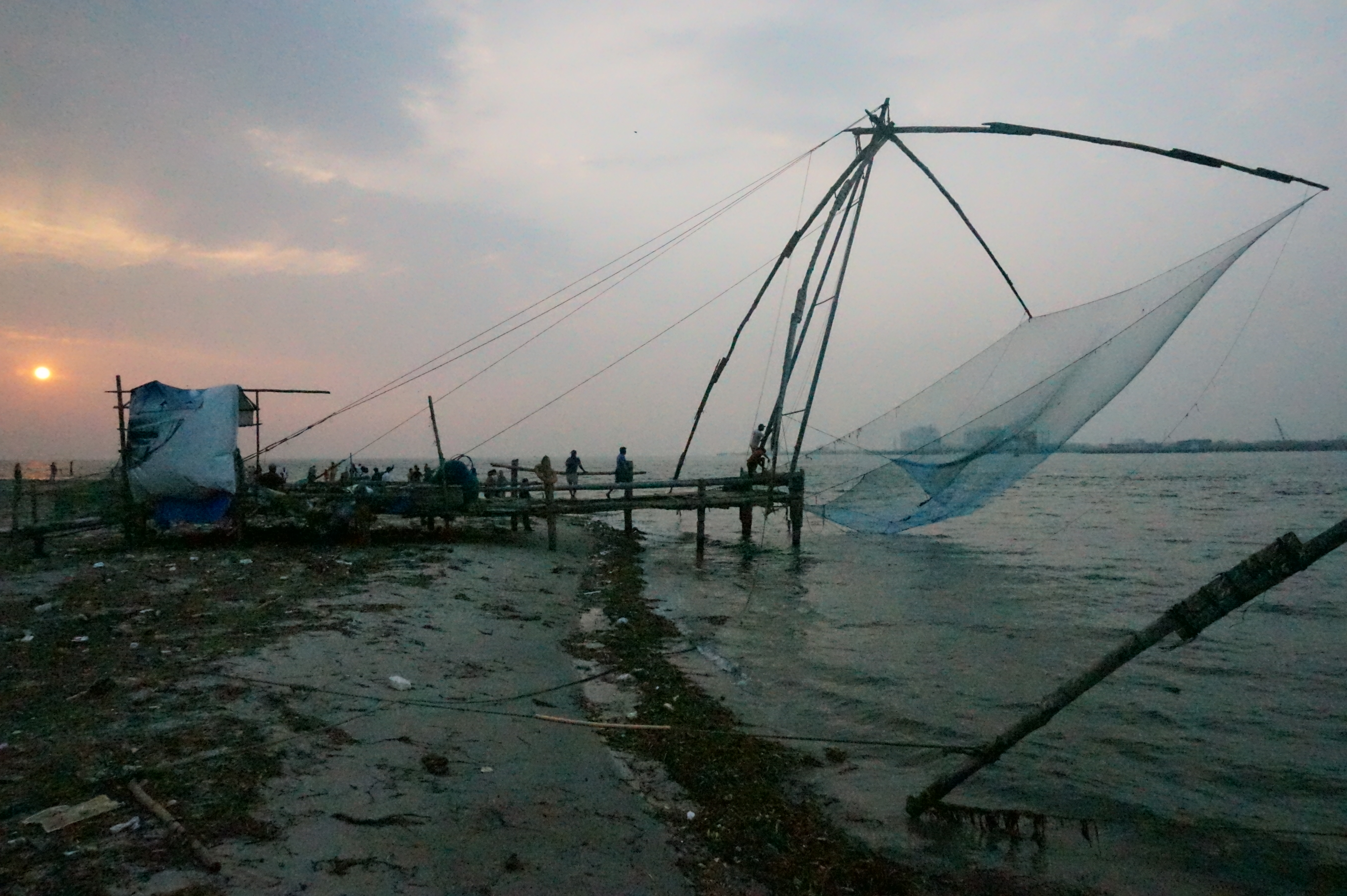 Hoy nos hemos dedicado a ver “nuestro barrio” durante estos días, Fort Cochin, una zona de Cochin donde podríamos decir que las principales características son la pesca con redes chinas suspendidas (hay decenas a lo largo del paseo marítimo), las tiendas de antigüedades y alfombras, los “lavaderos” de ropa a mano y sobretodo ver como conviven todas las religiones (hindus, musulmanes, cristianos, judíos…) con total respeto los unos hacía los otros…